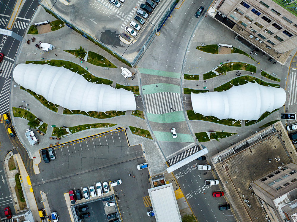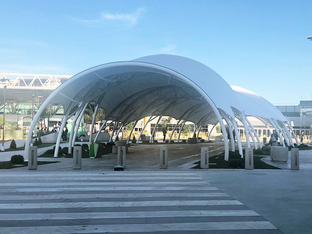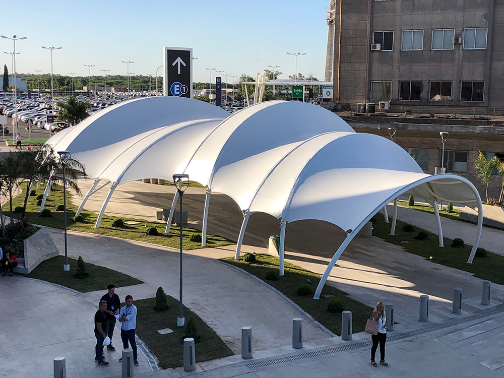 Este diseño no solo cubre el espacio de manera eficiente, sino que también genera un foco visual como hito dentro del predio aportando a su identidad visual.