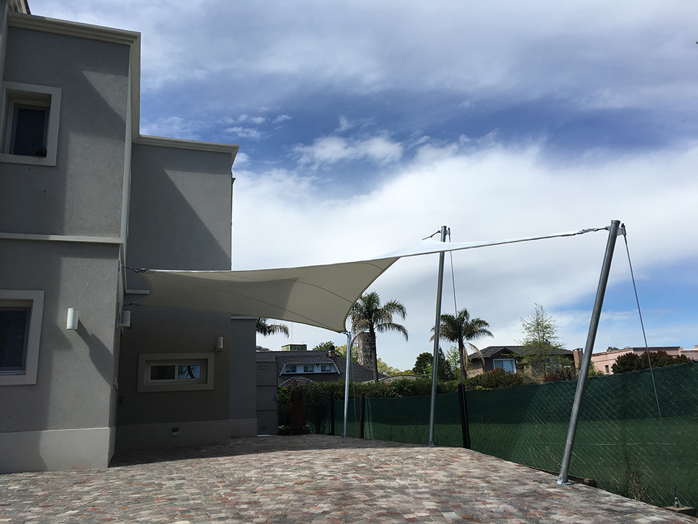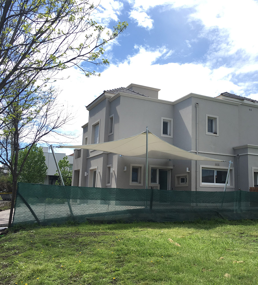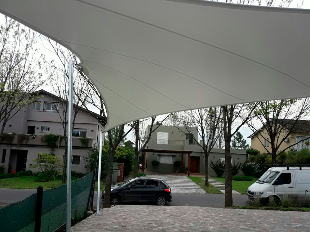Especificación: Membrana textil tensada Ferrari 502, vinculada a estructura metálica de anclaje.