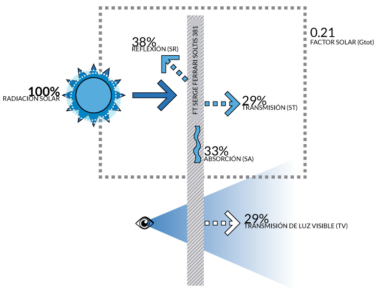 Como ejemplo un membrana Serge Ferrari Front View FT381 tiene una transmisión solar de alrededor del 29%, eso significa que sobre el 100% de incidencia solar que actúa sobre ella, aproximadamente hay una reducción de un 70%.