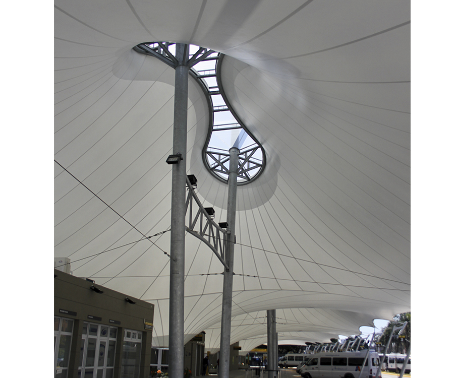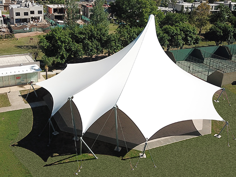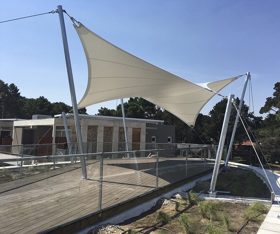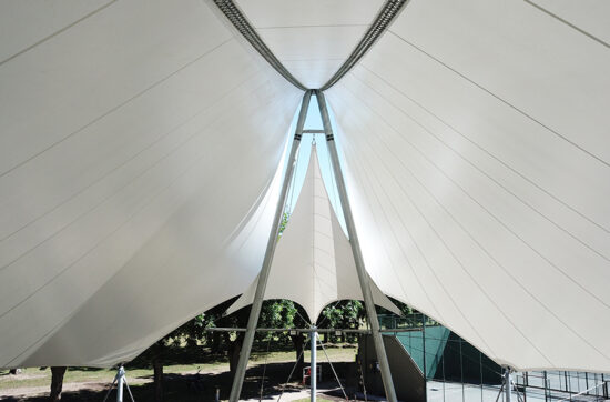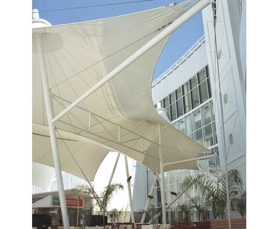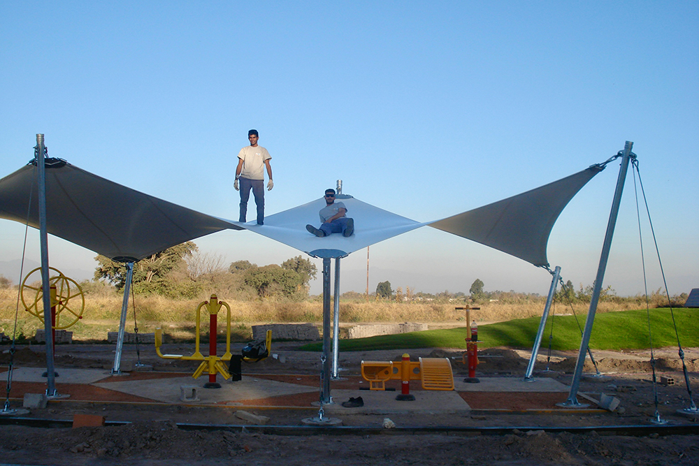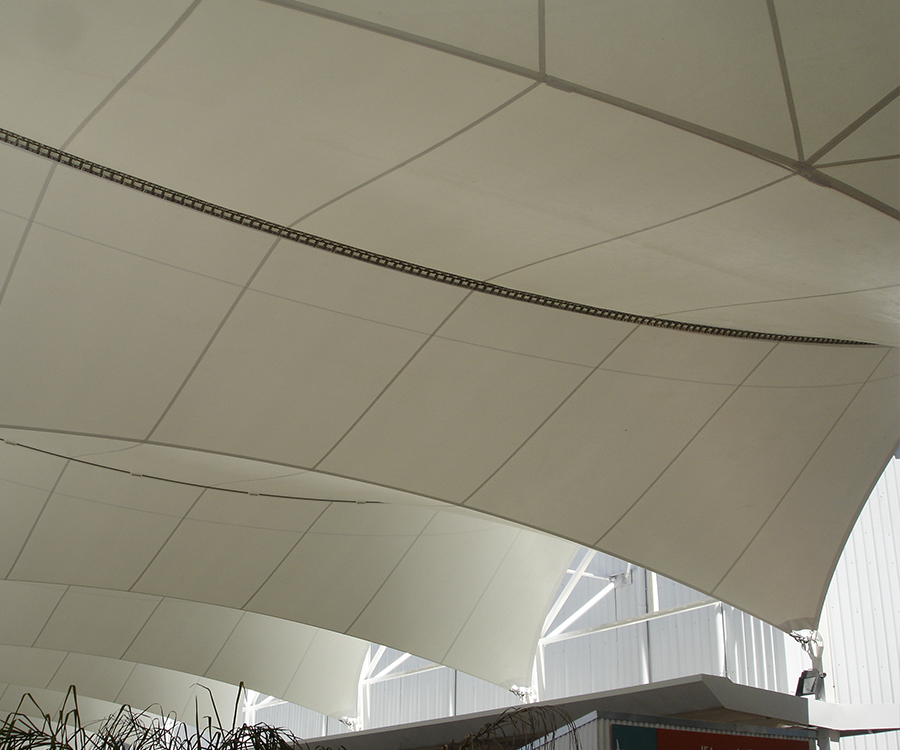 Las Cubiertas Tensadas son estructuras ligeras en las que una membrana textil sometida a esfuerzos de tracción adopta la forma de equilibrio que le aporta su estabilidad y a la vez identidad visual.
