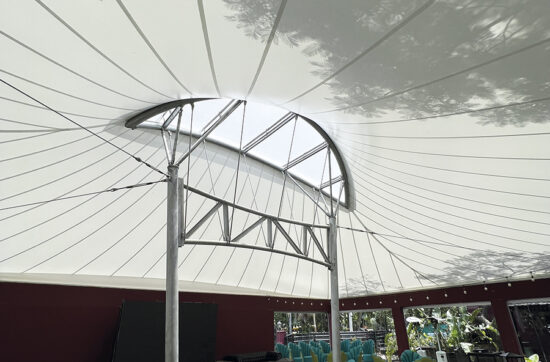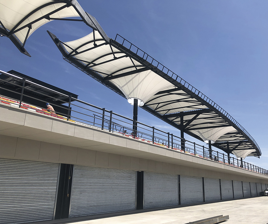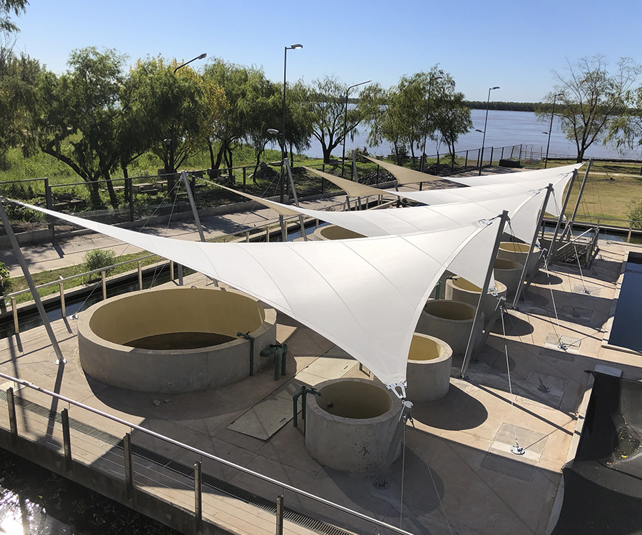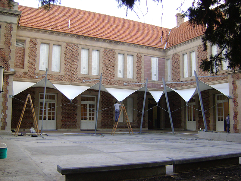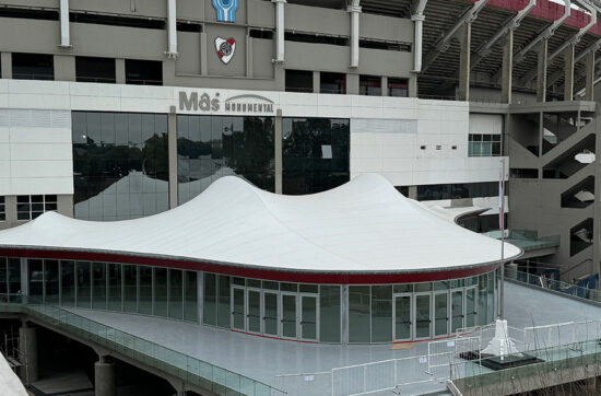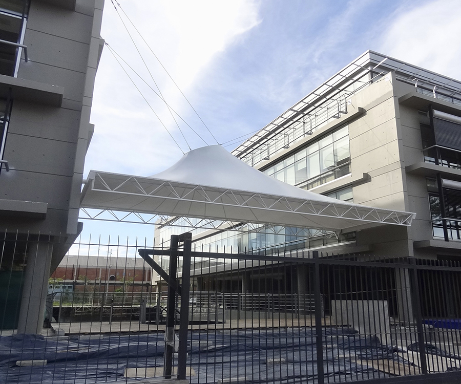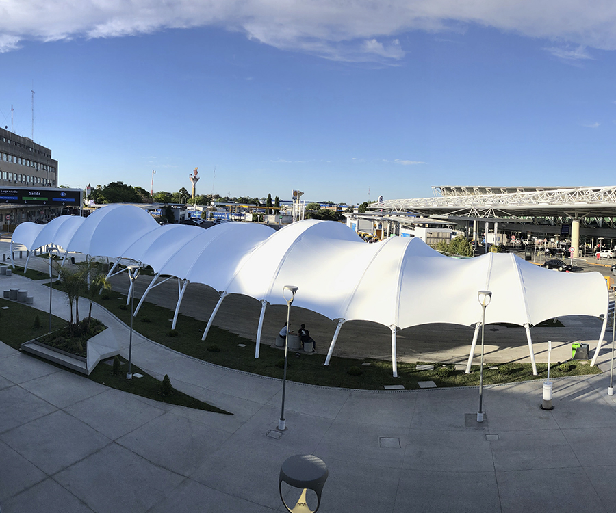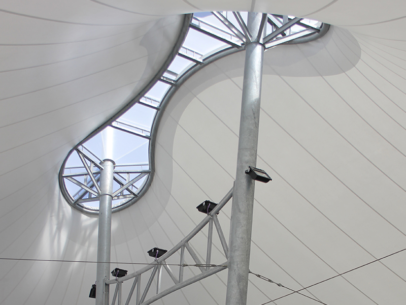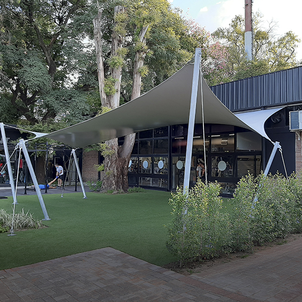 Las Cubiertas Tensadas son estructuras ligeras en las que una membrana textil sometida a esfuerzos de tracción adopta la forma de equilibrio que le aporta su estabilidad y a la vez identidad visual.