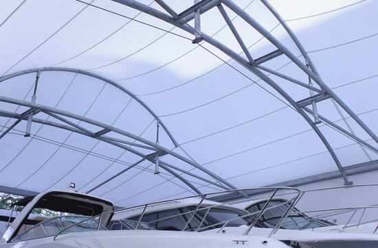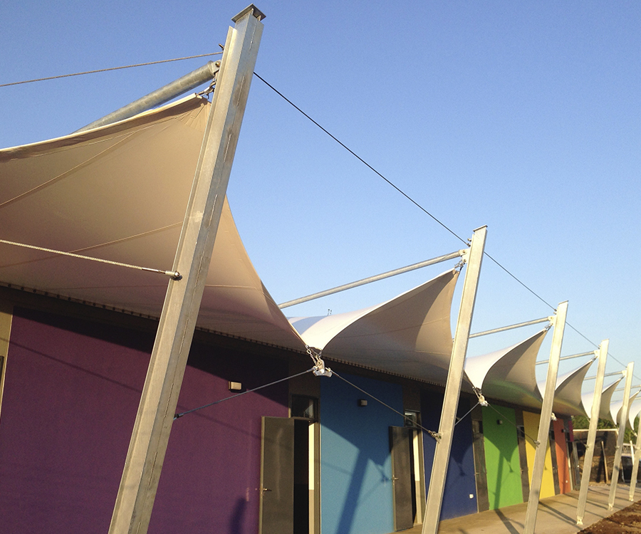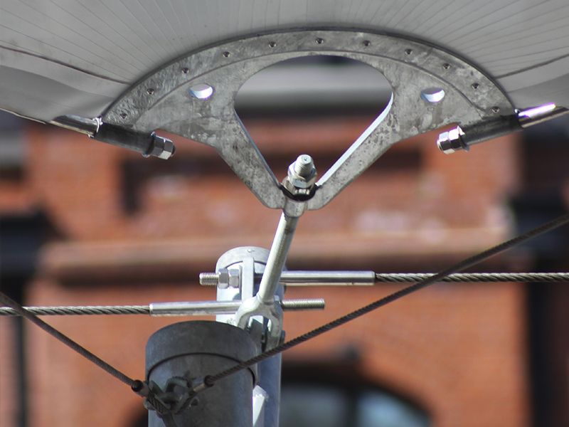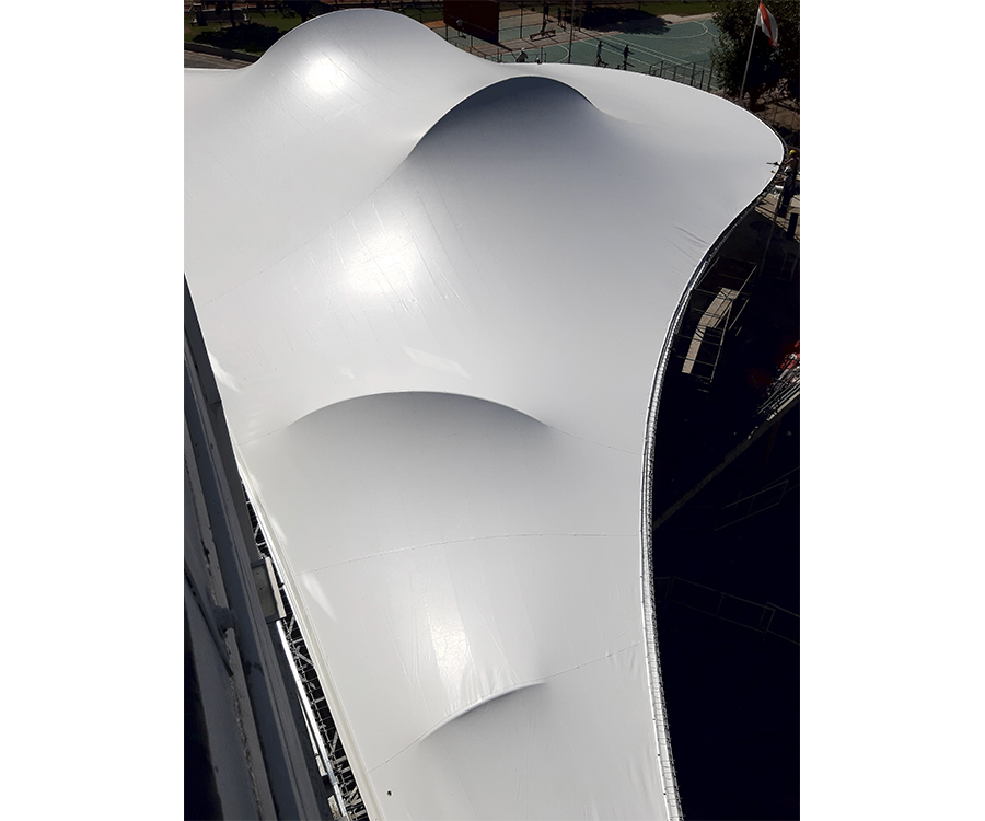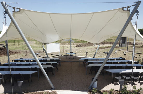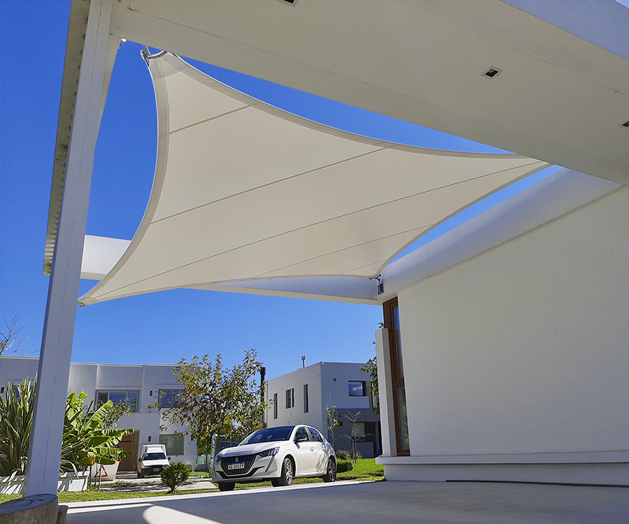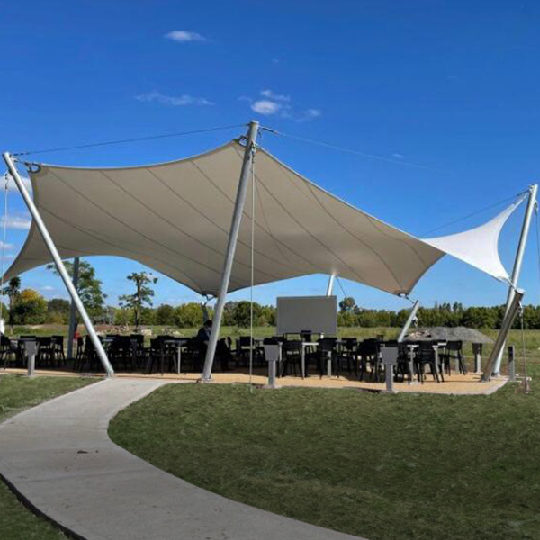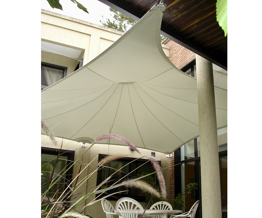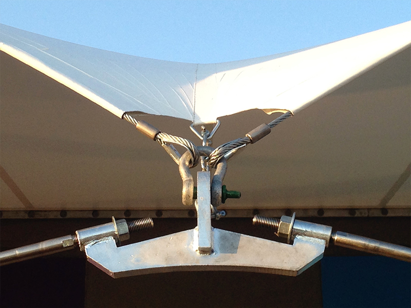 Las Cubiertas Tensadas son estructuras ligeras en las que una membrana textil sometida a esfuerzos de tracción adopta la forma de equilibrio que le aporta su estabilidad y a la vez identidad visual.
