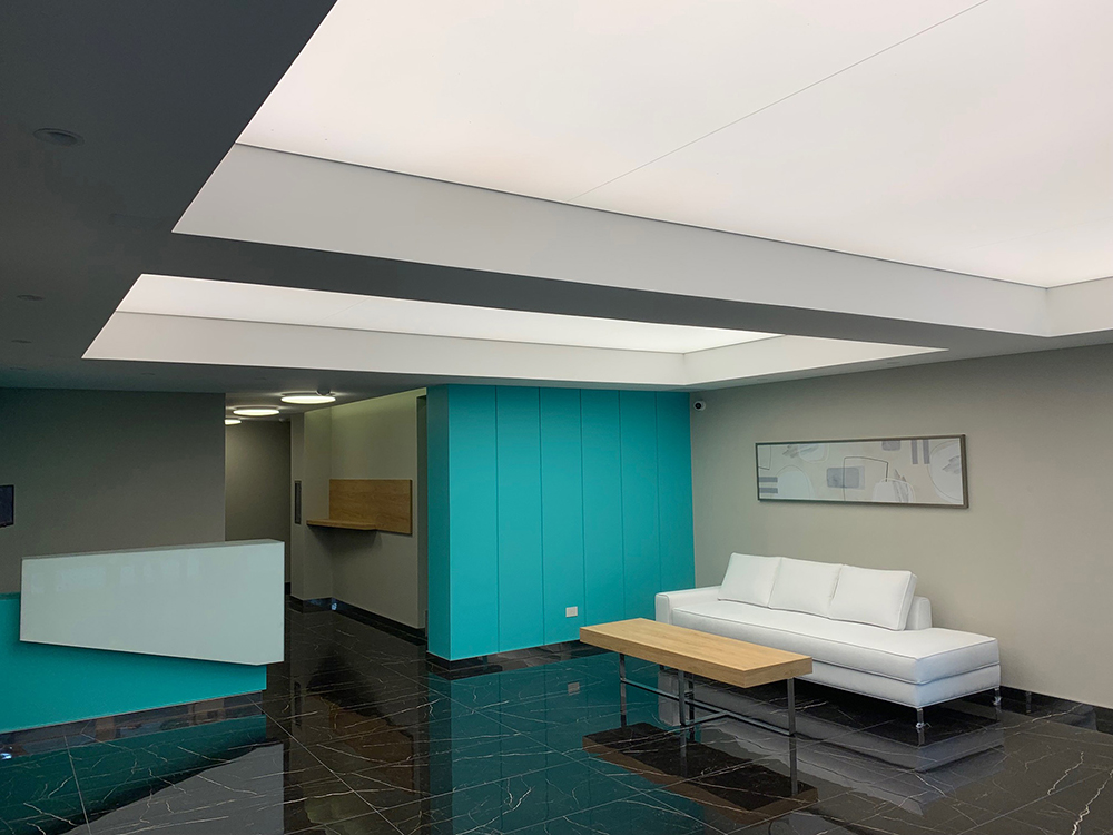 El Estudio PEA Arquitectura contactó a WAGG Arquitectura Textil para la materialización de los cielorrasos del Hall ubicado en Jose Cubas 3970. Se desarrolló con tela BARRISOL translúcida en la alternativa doble tela generando una superficie de iluminación homogénea donde la combinación entre la translucencia del film y su excelente capacidad de difusión tangencial se refleja en el espacio con iluminacion pareja y suave donde se destaca la calidad de terminación de la superficie iluminada. Al optar por la alternativa de doble tela, es decir, la tela inferior translúcida y la tela superior transparente, la suciedad o bichitos que pudiera alojarse quedaría en esta última evitando que queden a la vista en la tela translúcida y por lo tanto prolongando la necesidad de mantenimiento.