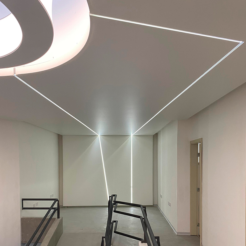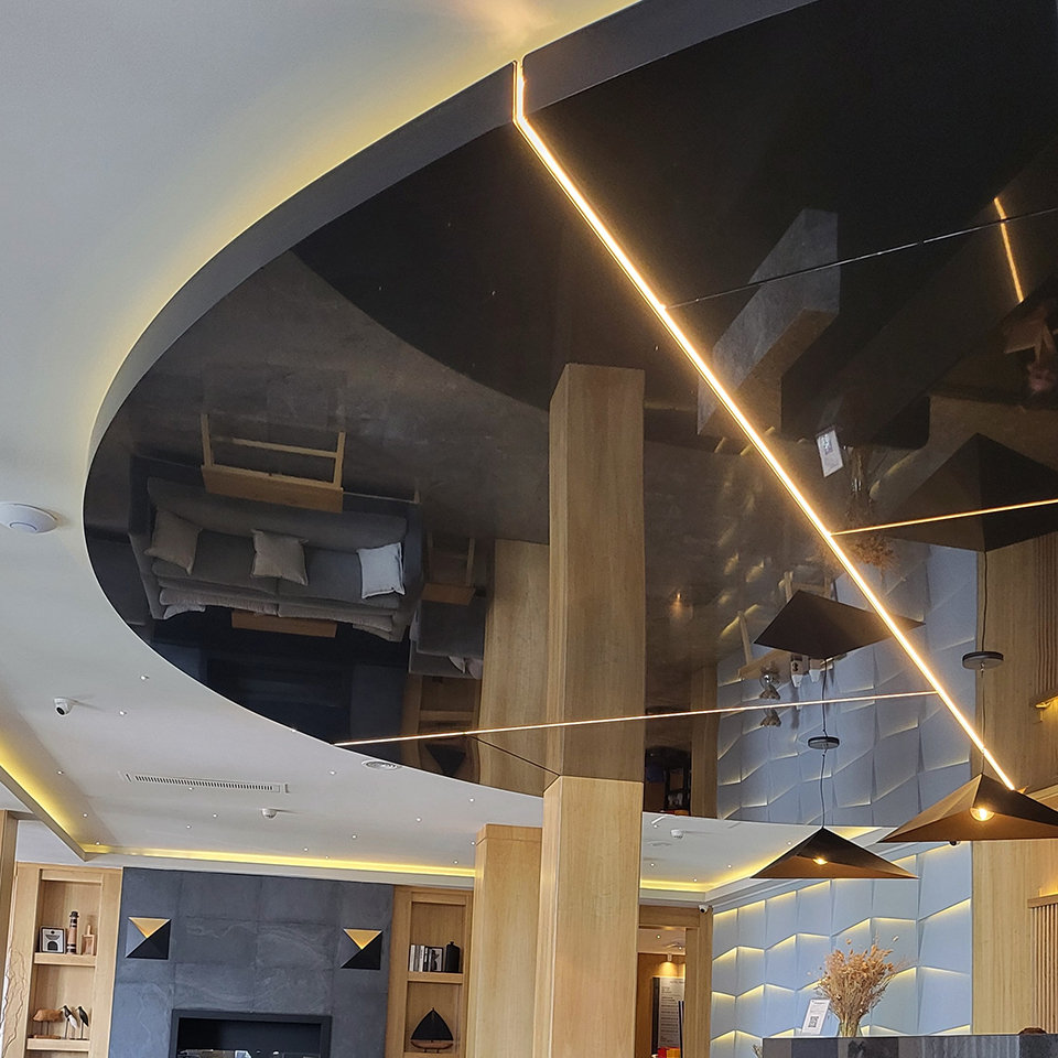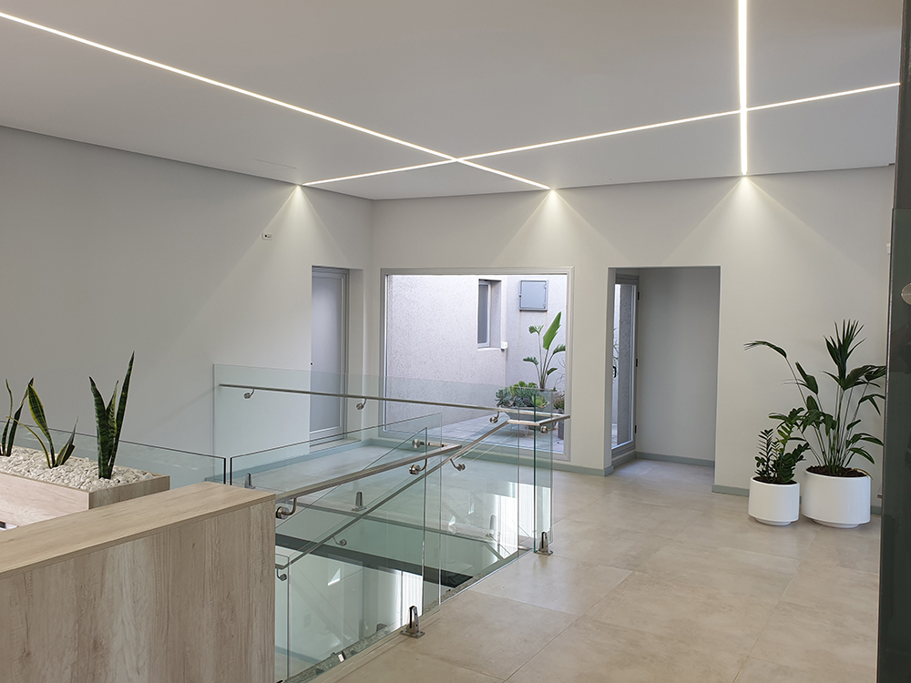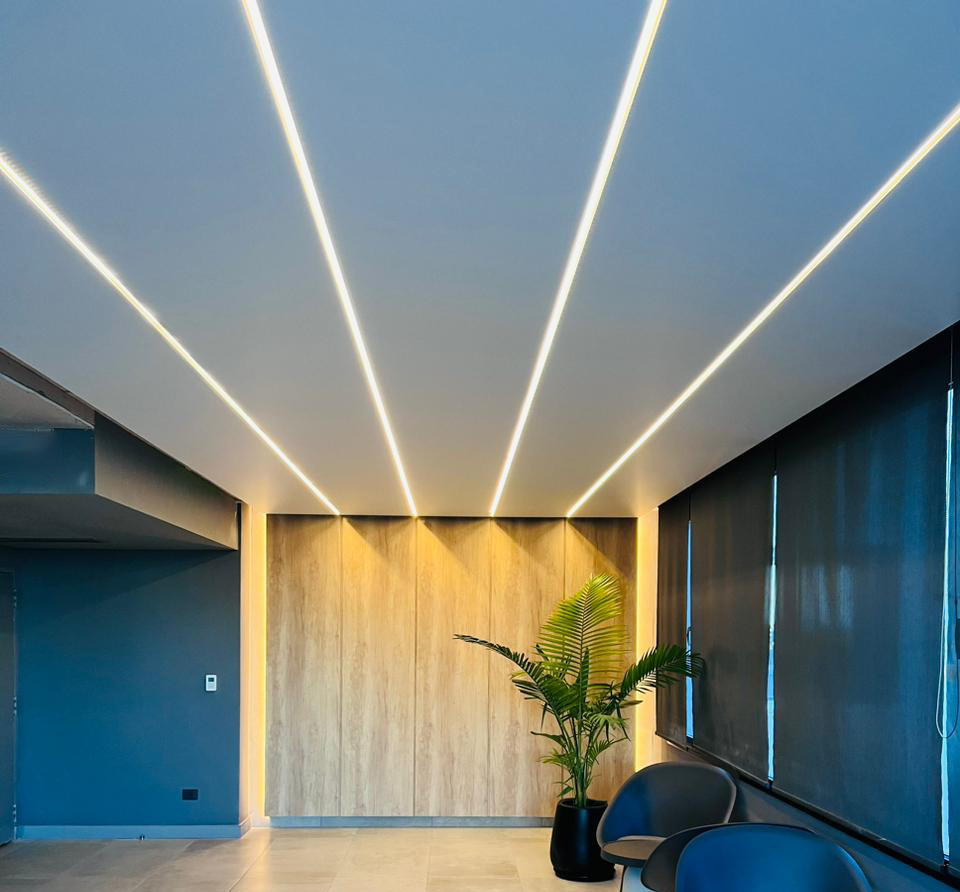 El sistema de Cielorrasos Tensados conserva su esencia —el anclaje y la elasticidad del film— incorporando perfiles diseñados para alojar iluminación LED, lo que permite integrar la iluminación y el plano del cielorraso en una misma solución que combina funcionalidad y un impecable acabado superficial.