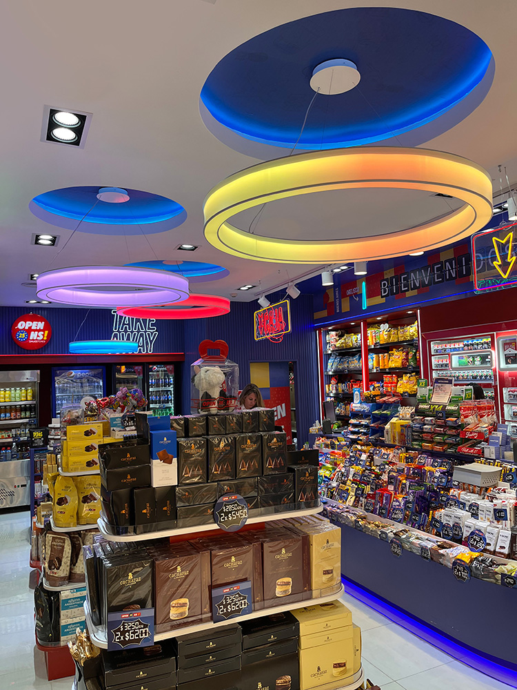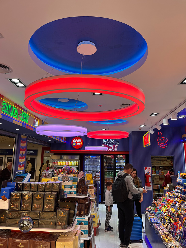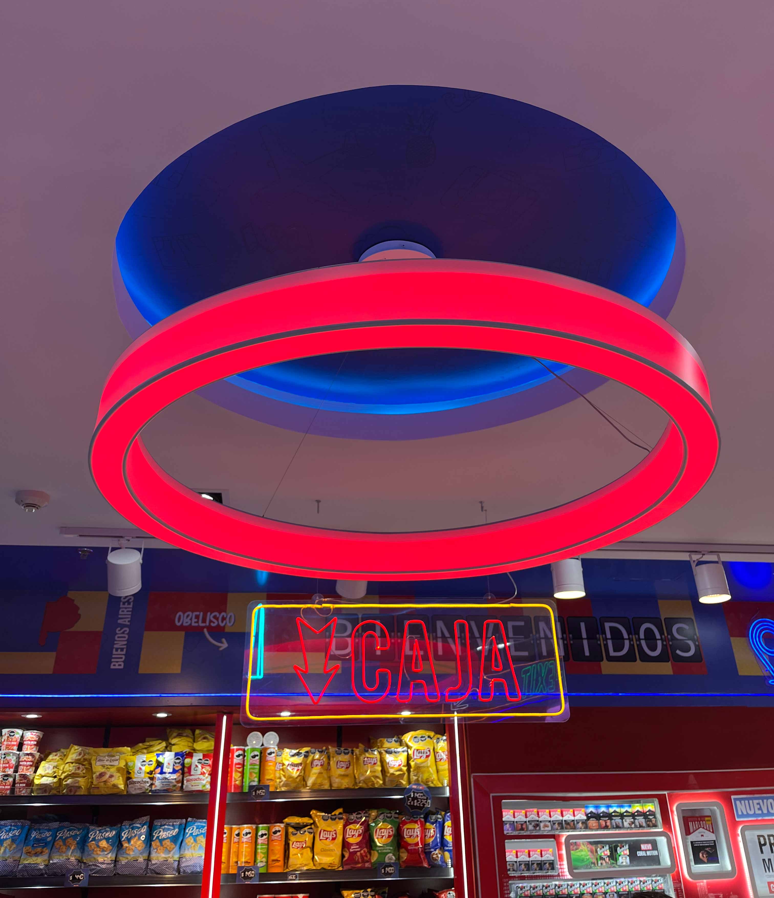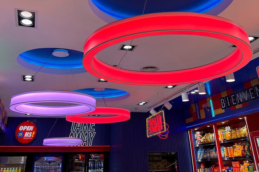 El Arq. Daniel Bolff contactó a WAGG Arquitectura Textil para desarrollar 4 lámparas con la tipología de anillo y aplicando el sistema de iluminación RGB para lograr un efecto distintivo al local, mediante mantos lumínicos de diferente color e intensidad.