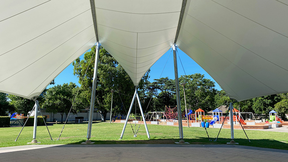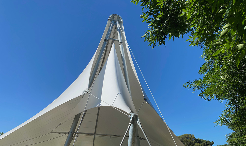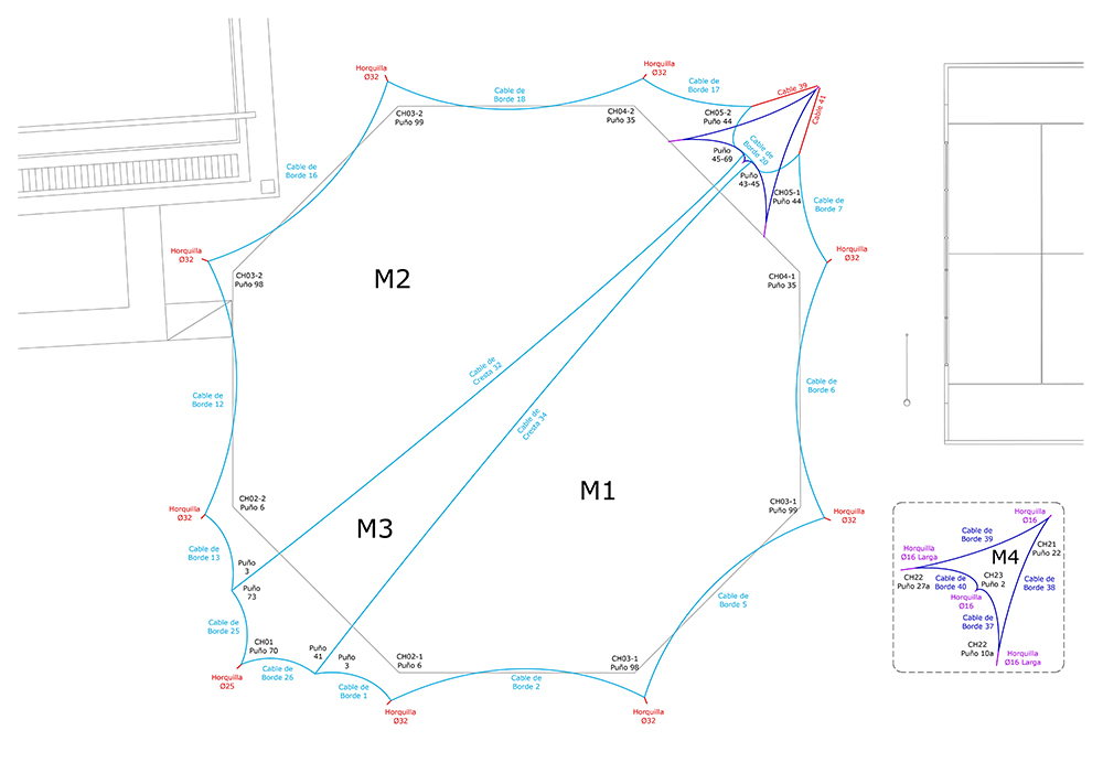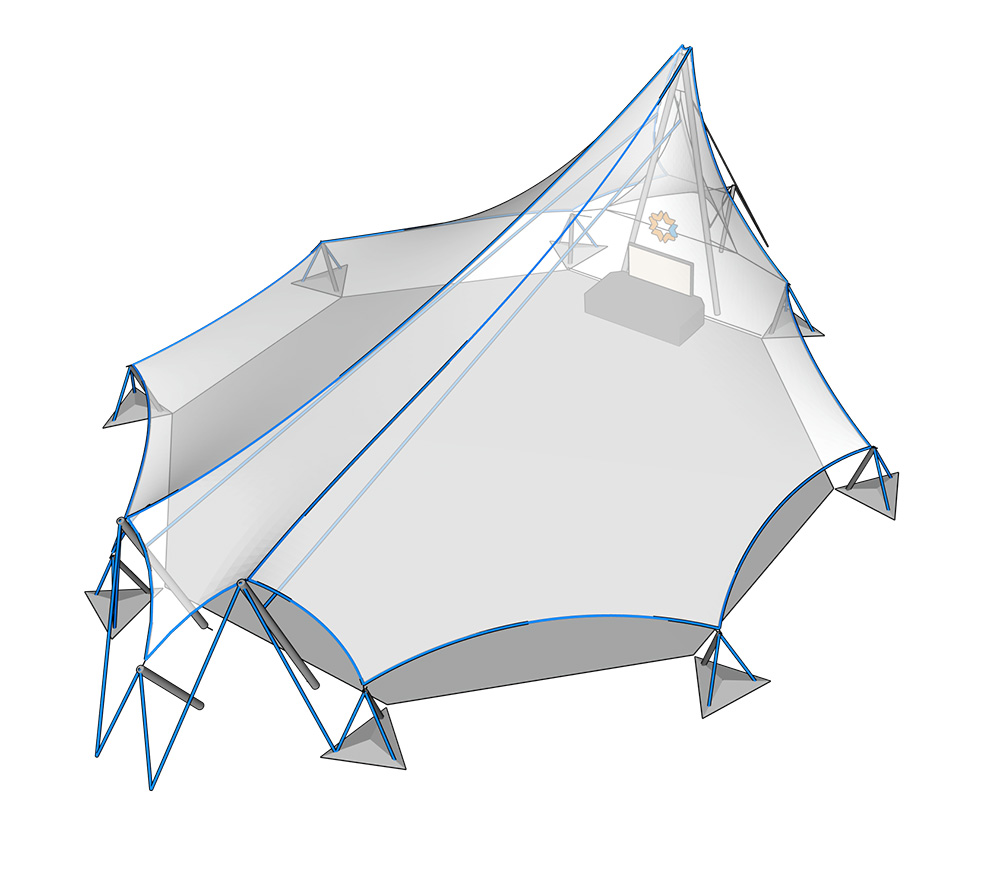 A partir de un estudio detallado desarrollamos una tensoestructura de gran escala que se desarrolla a partir de un eje transversal al octógono de base, materializado por dos cables (de cresta) desde los cuales descienden los dos faldones cuyos puntos bajos recomponen los bordes del espacio.
