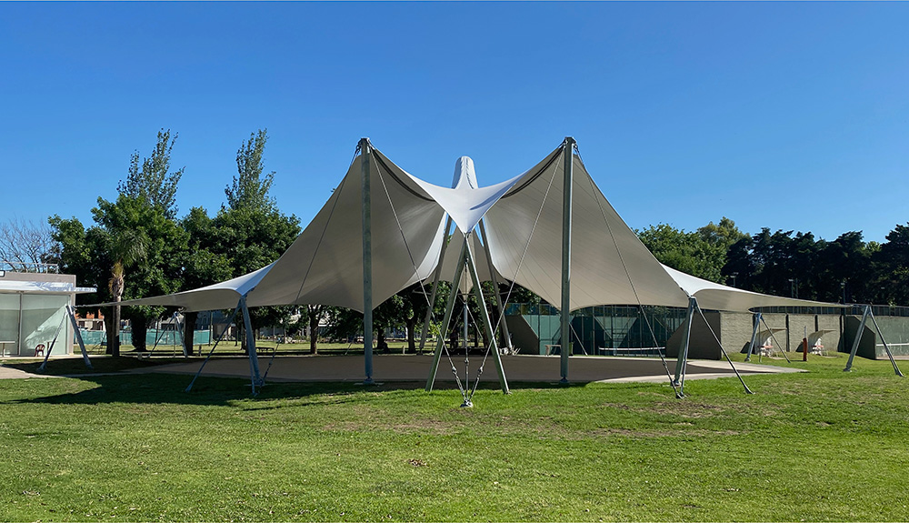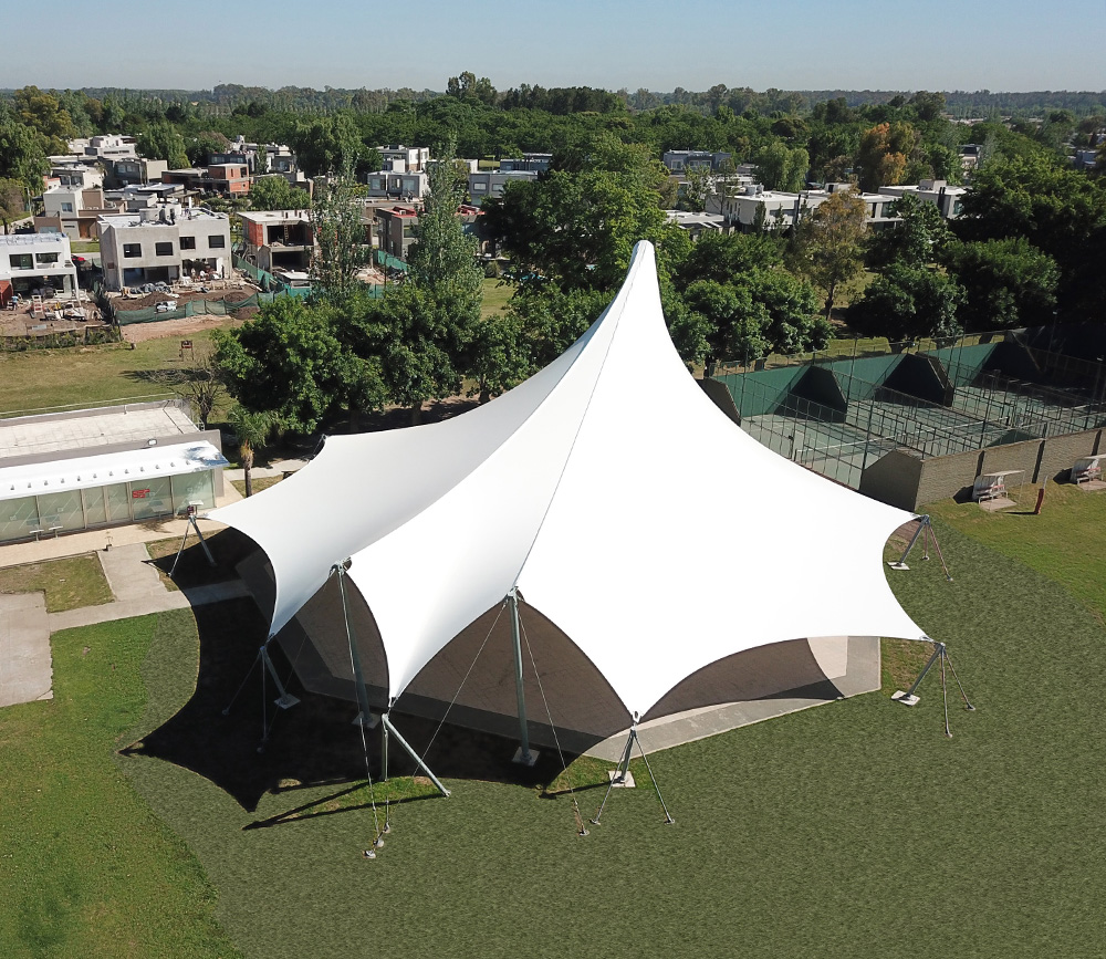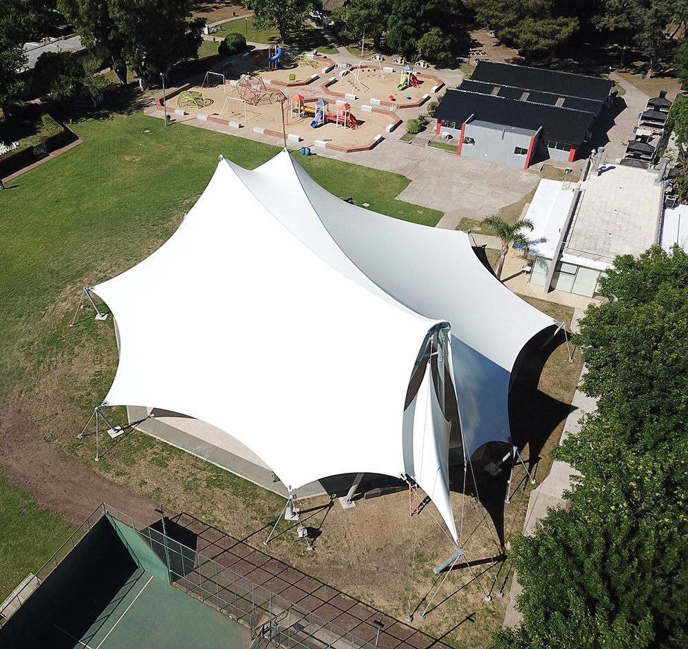 La comisión directiva del Country Cissab nos propuso el desafío de diseñar una cubierta tensada para el Rikudómetro, un espacio clave para la comunidad judía donde se celebran encuentros y actividades de baile al aire libre. En WAGG Arquitectura Textil desarrollamos la Cubierta Tensada de Rikudómetro, un proyecto que evolucionó desde los esquemas estructurales preliminares a la concreción de una obra de 1000m2 cubiertos.