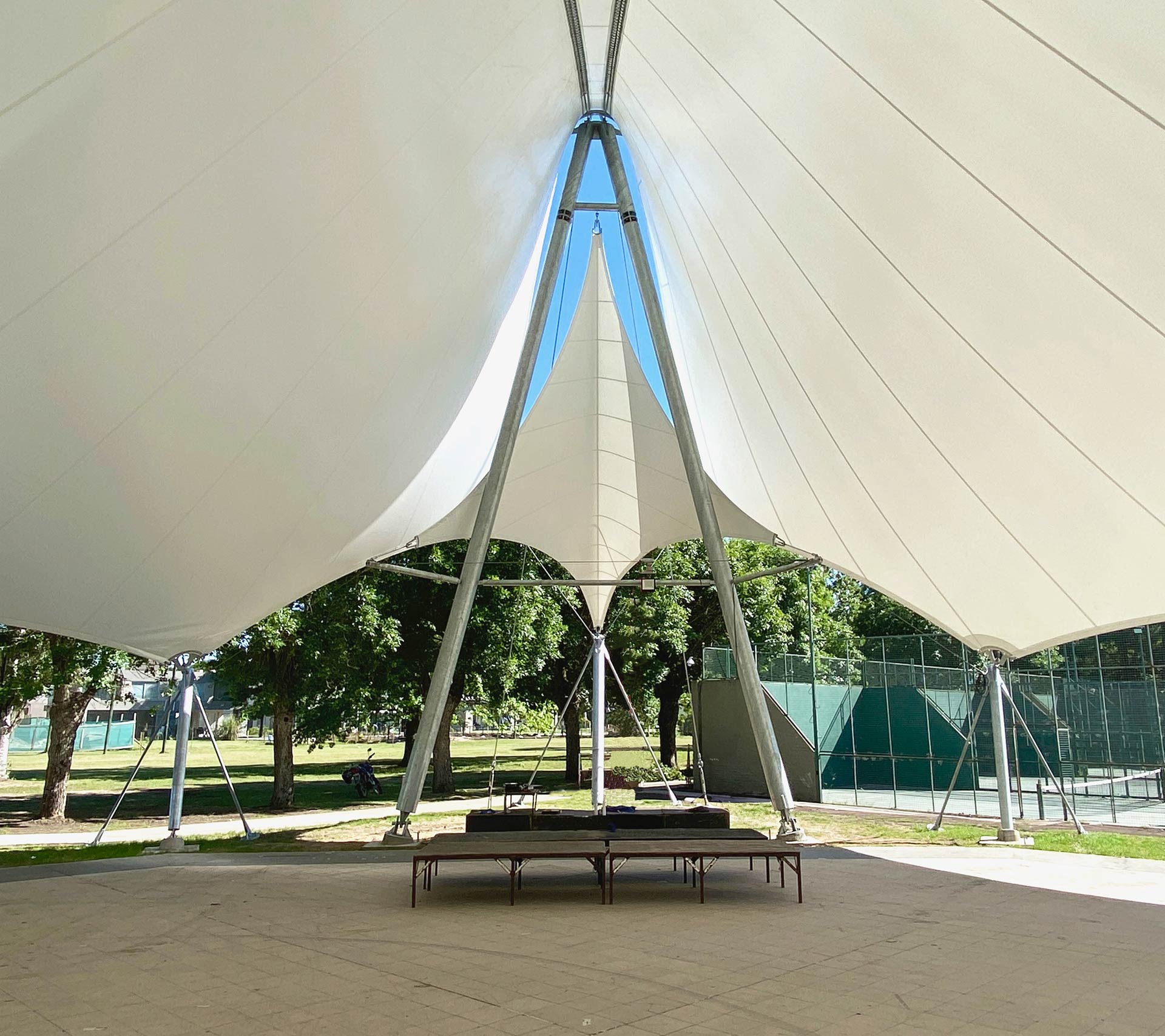 Los cables colectores principales dan forma a la superficie y ascienden hacia uno de los puntos del octógono de base, donde se ubica el escenario. El extremo opuesto se destaca como acceso, aunque el espacio puede abordarse desde todo su perímetro.