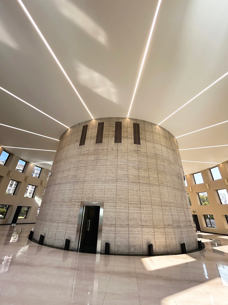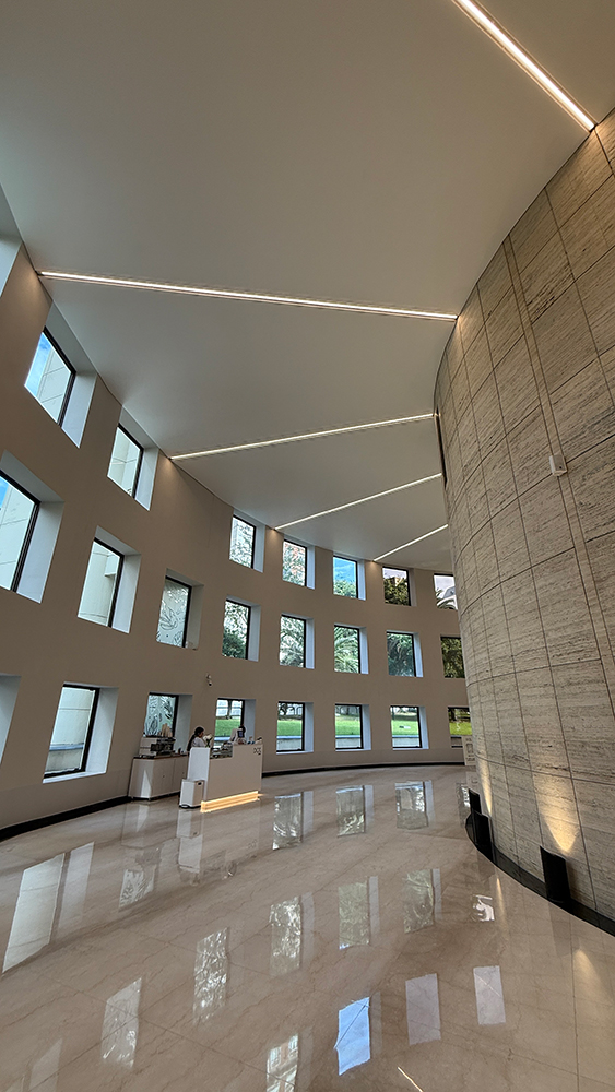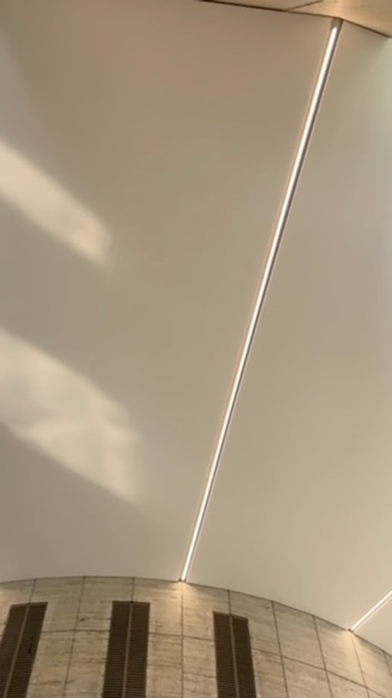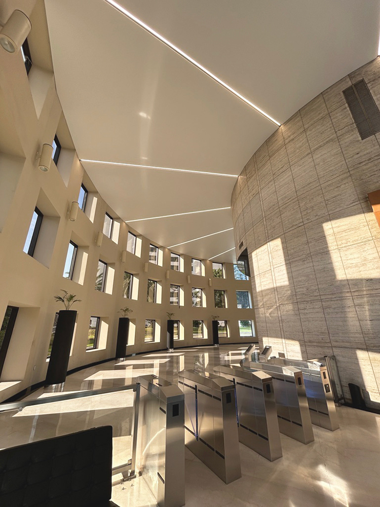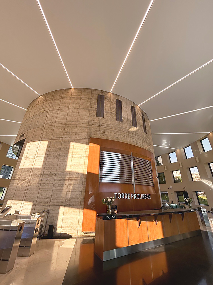 En WAGG materializamos el Cielorraso Tensado de la Torre Prourban, que resuelve técnica y estéticamente la definición del espacio interior del hall de acceso. La clara diagramación radial de los paños de cielorraso aporta una lectura limpia y ordenada, realzando el diseño minimalista del lugar.