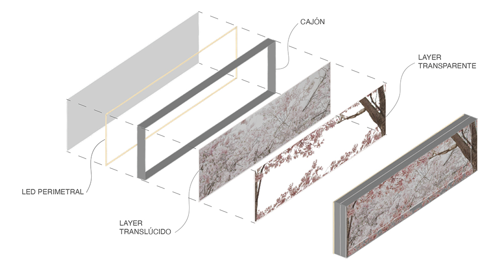 Layer concept: Este concepto potencia las posibilidades de los Translúcidos al permitir disponer capas de imágenes impresas en distintos planos. La combinación de estas capas produce un efecto de profundidad que se enfatiza con la iluminación perimetral.